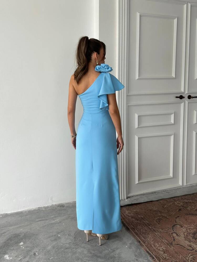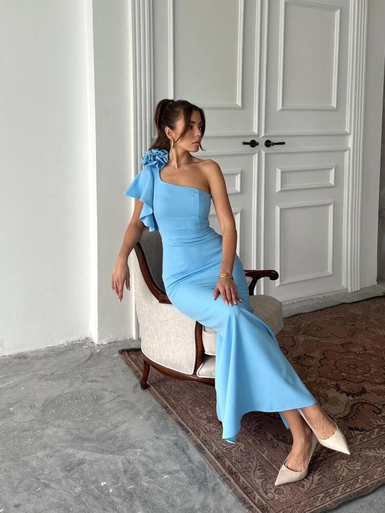 ANGELETTA MİDİ BOY KOL DETAY ATLAS KUMAŞ MAVİ ELBİSE