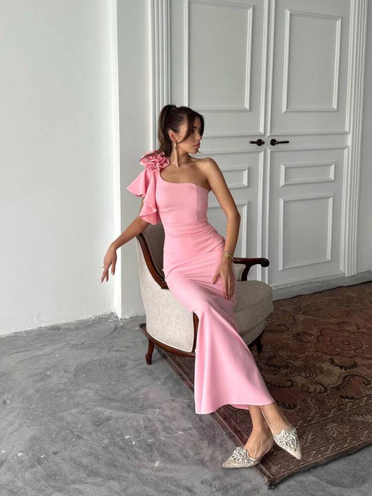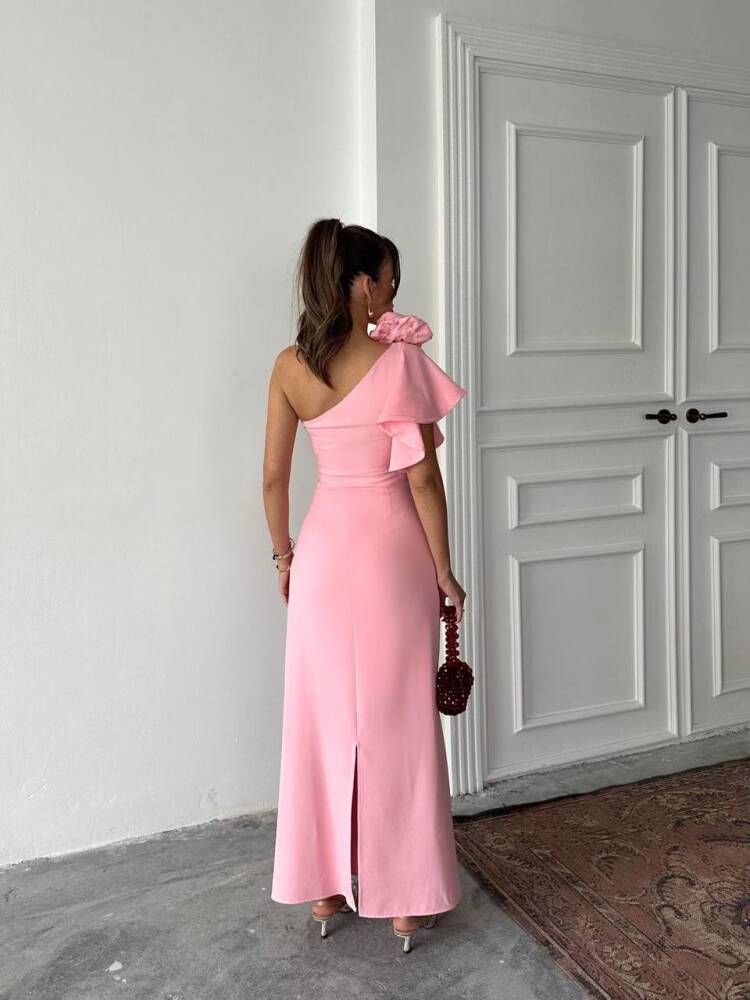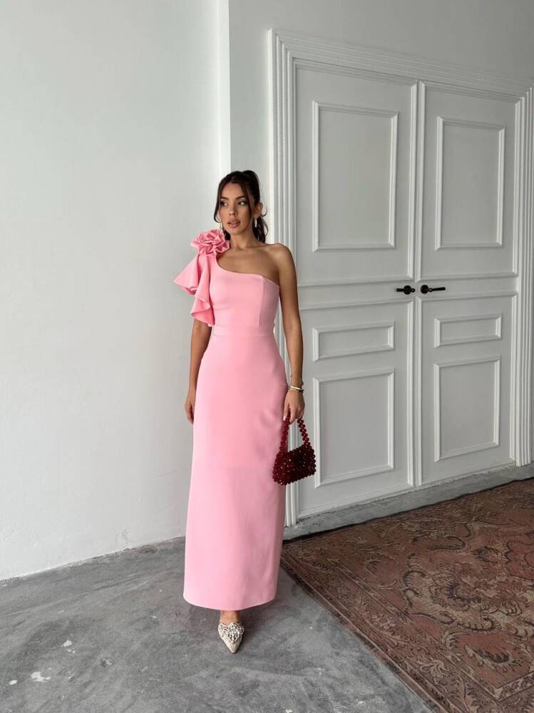ANGELETTA MİDİ BOY KOL DETAY ATLAS KUMAŞ PEMBE ELBİSE