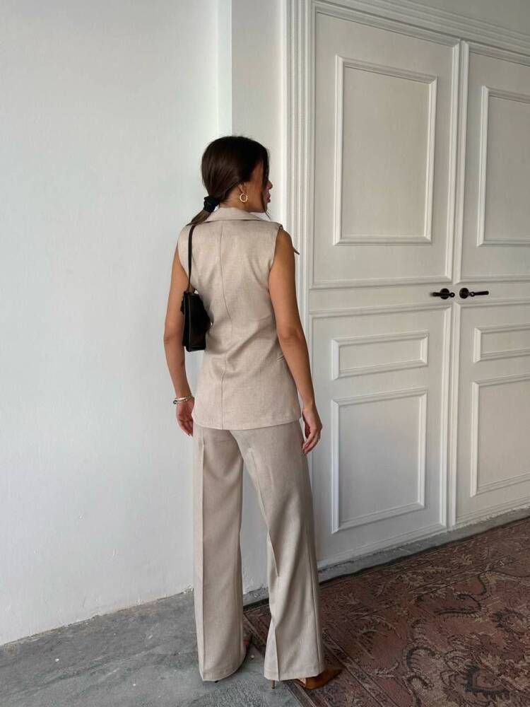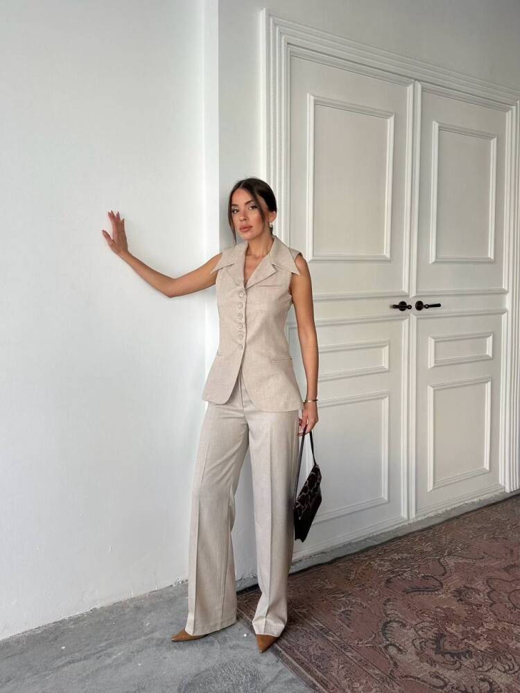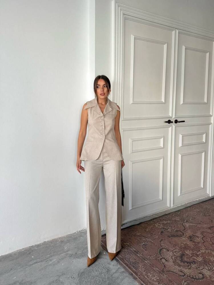 BONTİ RETRO YAKA İKİLİ KETEN BEJ TAKIM