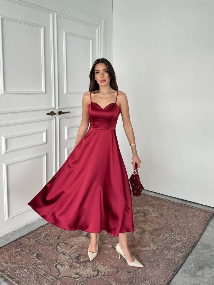 HANAN SATEN ASKILI MİDİ PRENSES BORDO ELBİSE