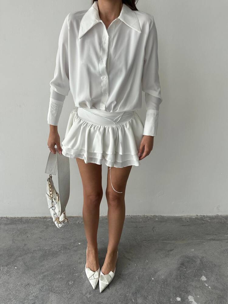 JANA KATLI BEL DETAYLI MİNİ TİRİL GOMLEK BEYAZ ELBİSE