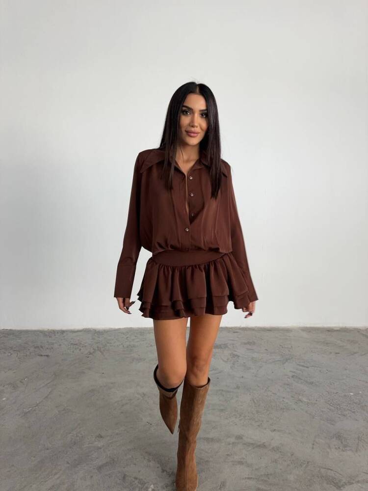 JANA KATLI BEL DETAYLI MİNİ TİRİL GOMLEK KAHVERENGİ ELBİSE