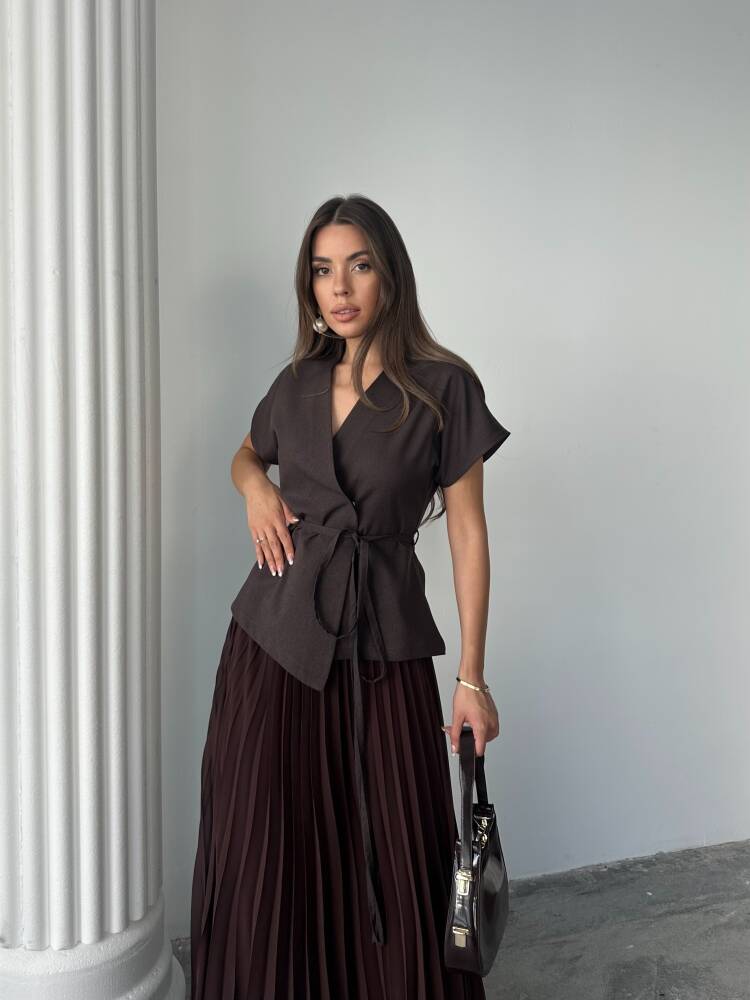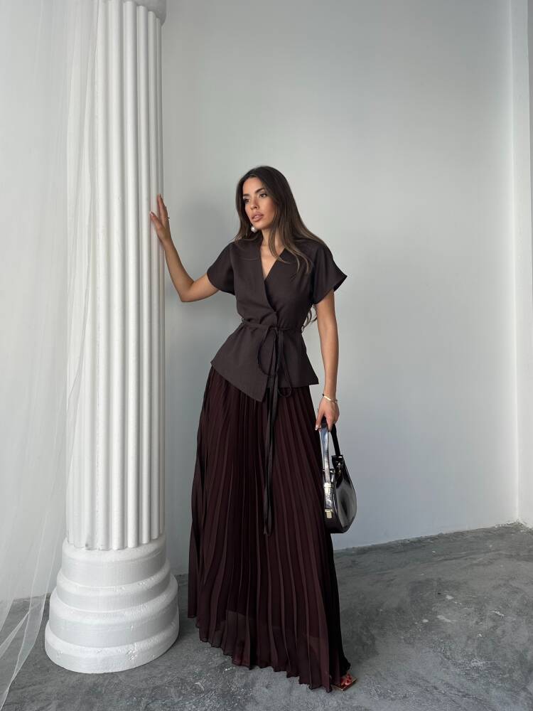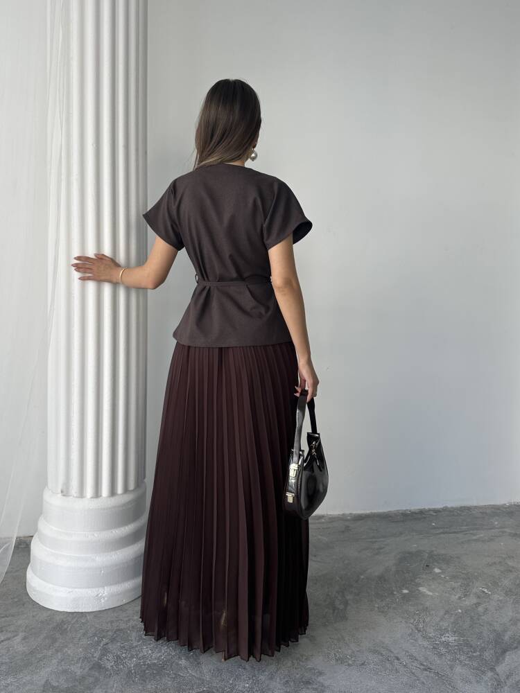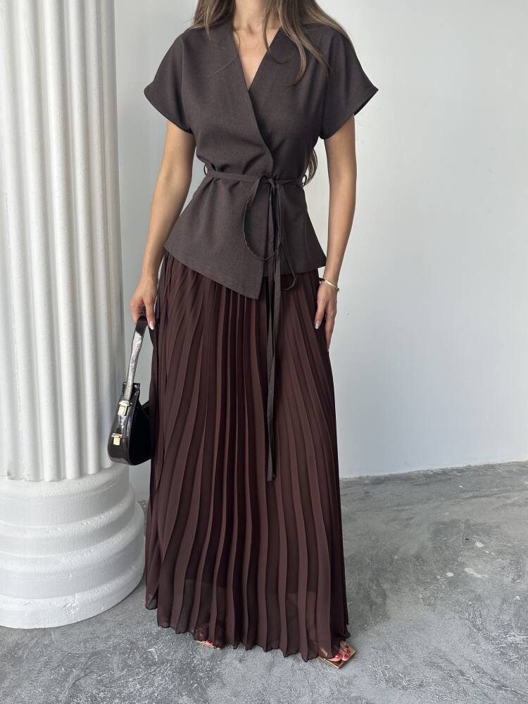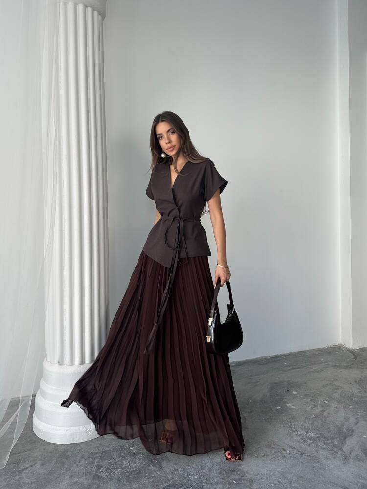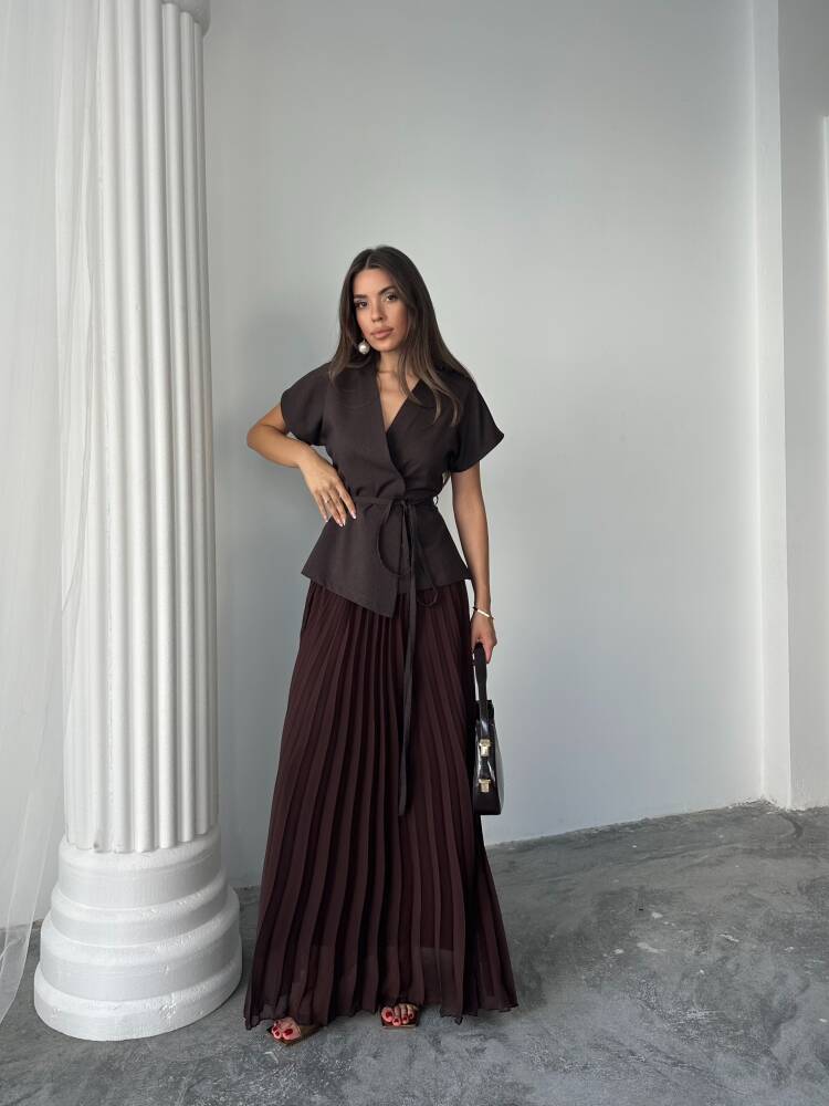 JESERA PİLELİ MAXİ ETEK KUŞAKLI CEKET KAHVERENGİ TAKIM