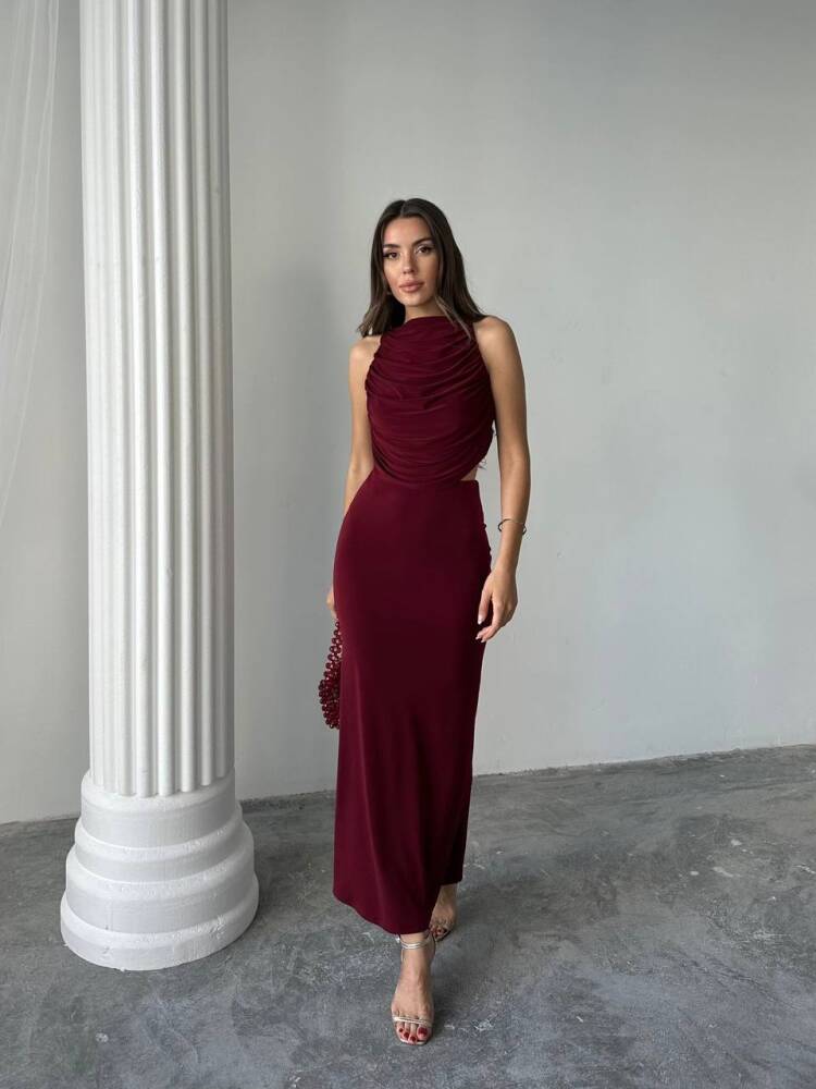 PLUS MAXİ ETEK DRAPELİ LİKRALI HALTER BLUZ BORDO TAKIM